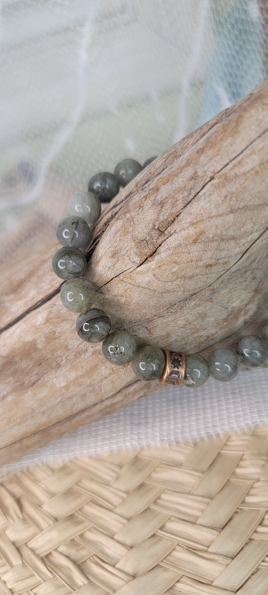 Beaded Moonstone & Blue Goldstone Necklace With Labradorite Cubic Zirconia Shell Charm.