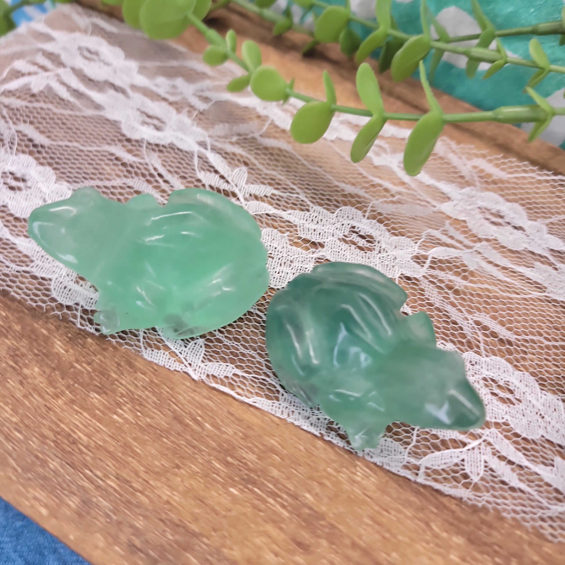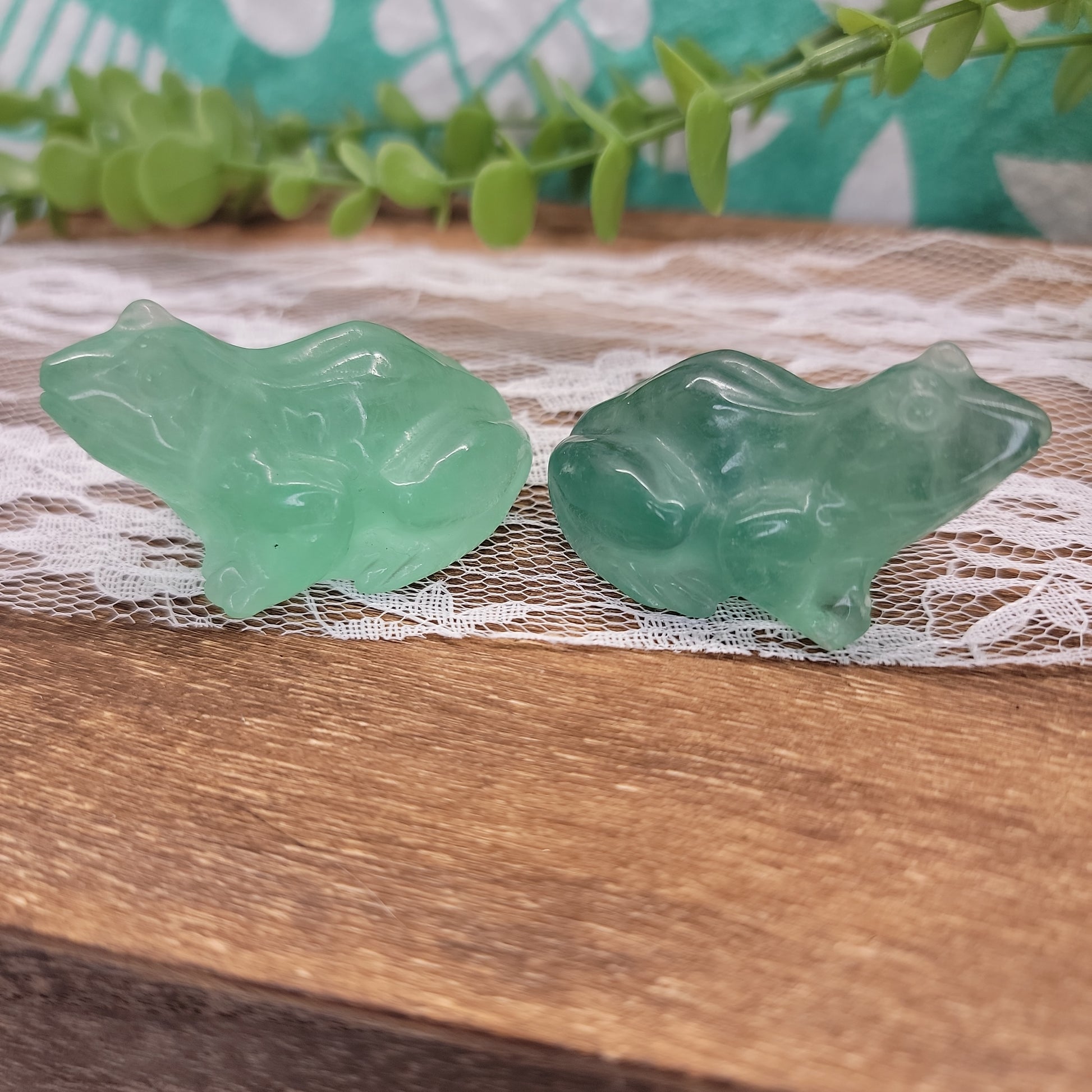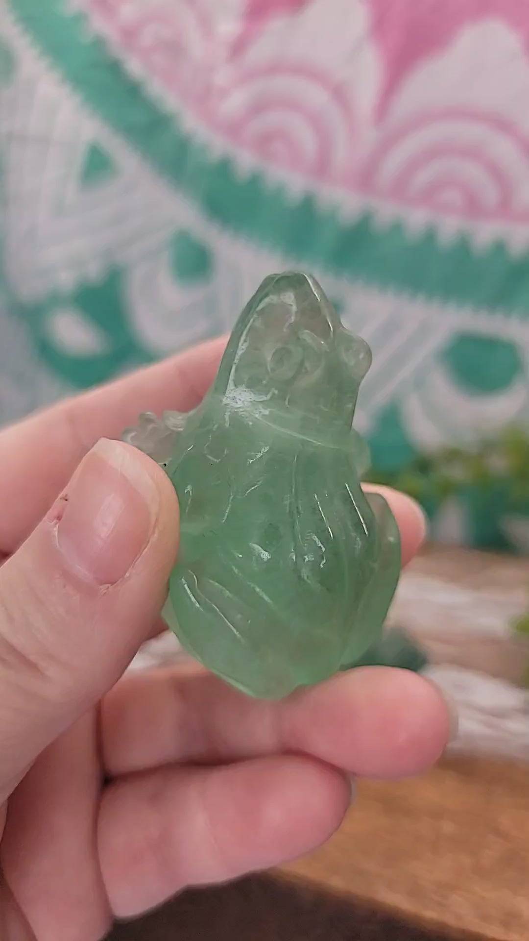 Fluorite frogs are natural carvings that can be found in a variety of colors, including blues, greens, and purples. Frogs are said to symbolize prosperity, cleansing, and renewal.
