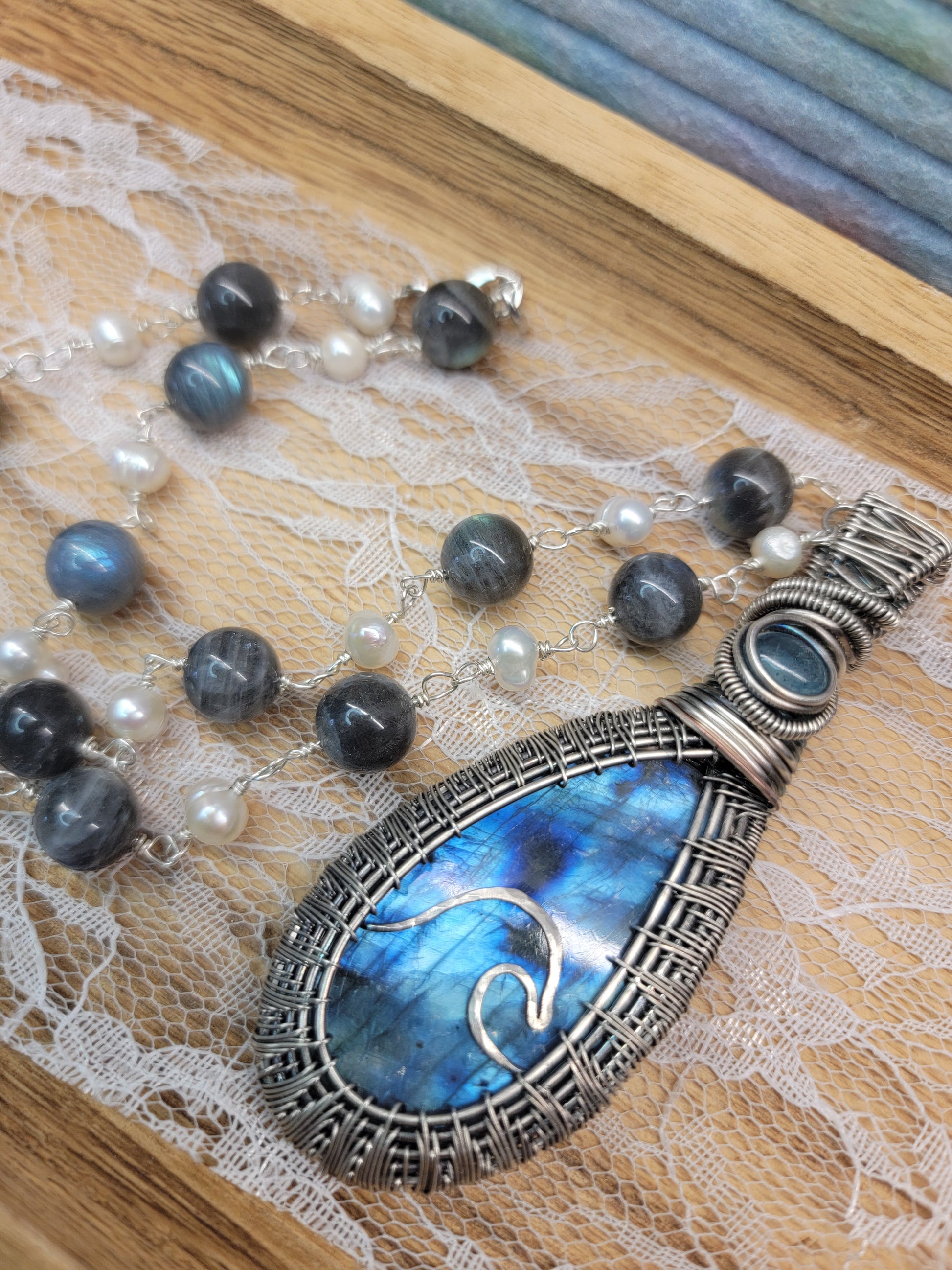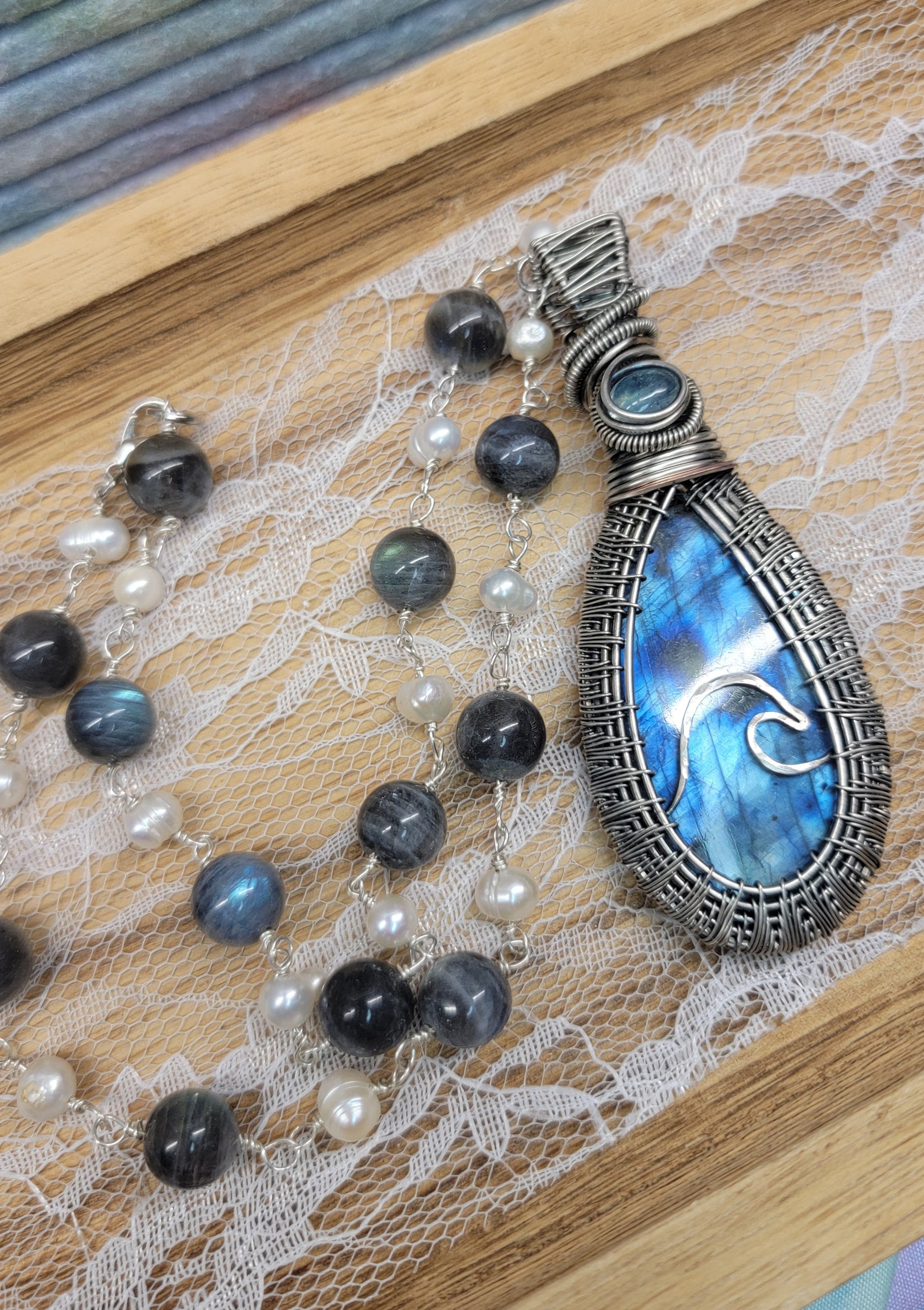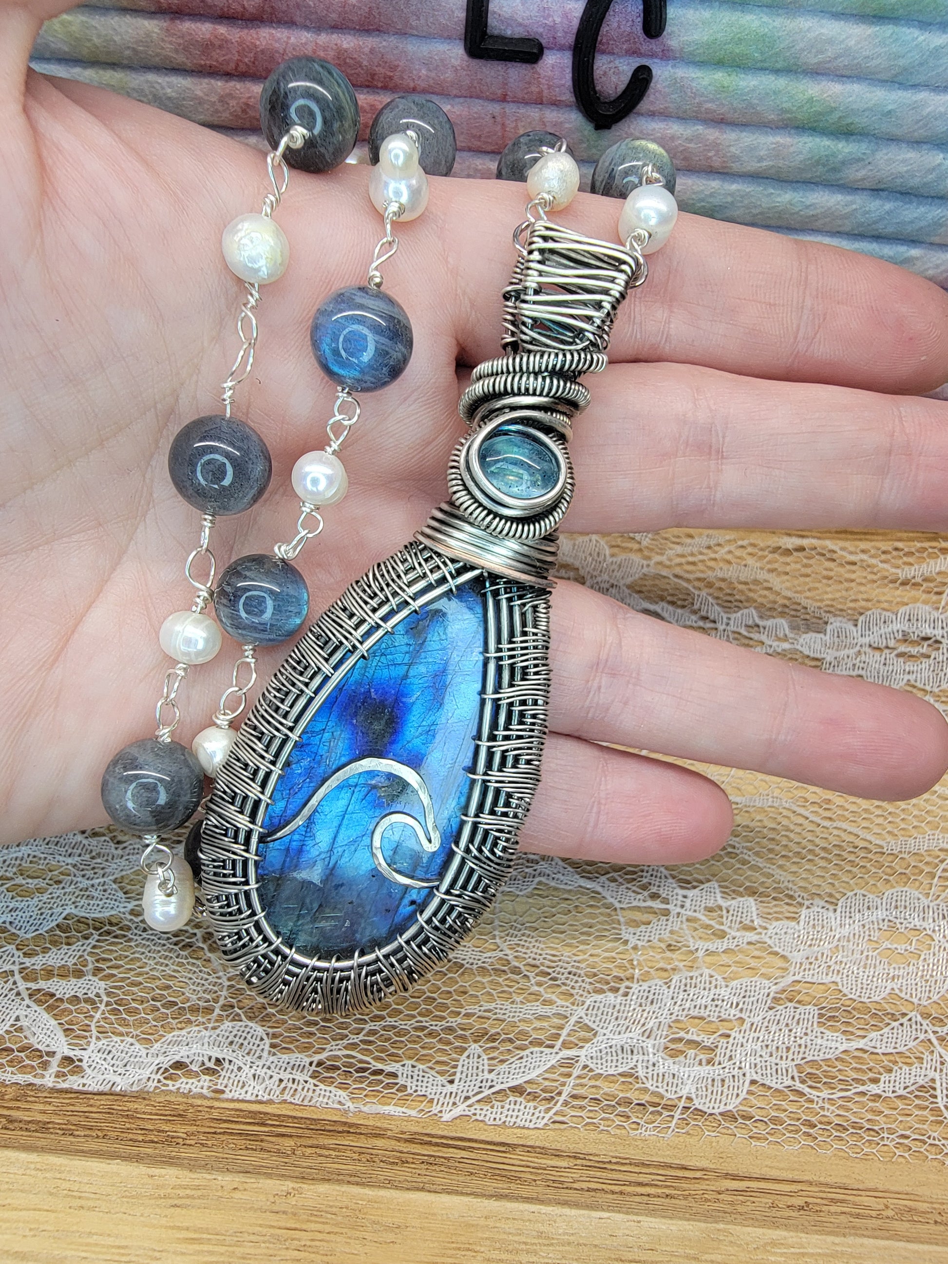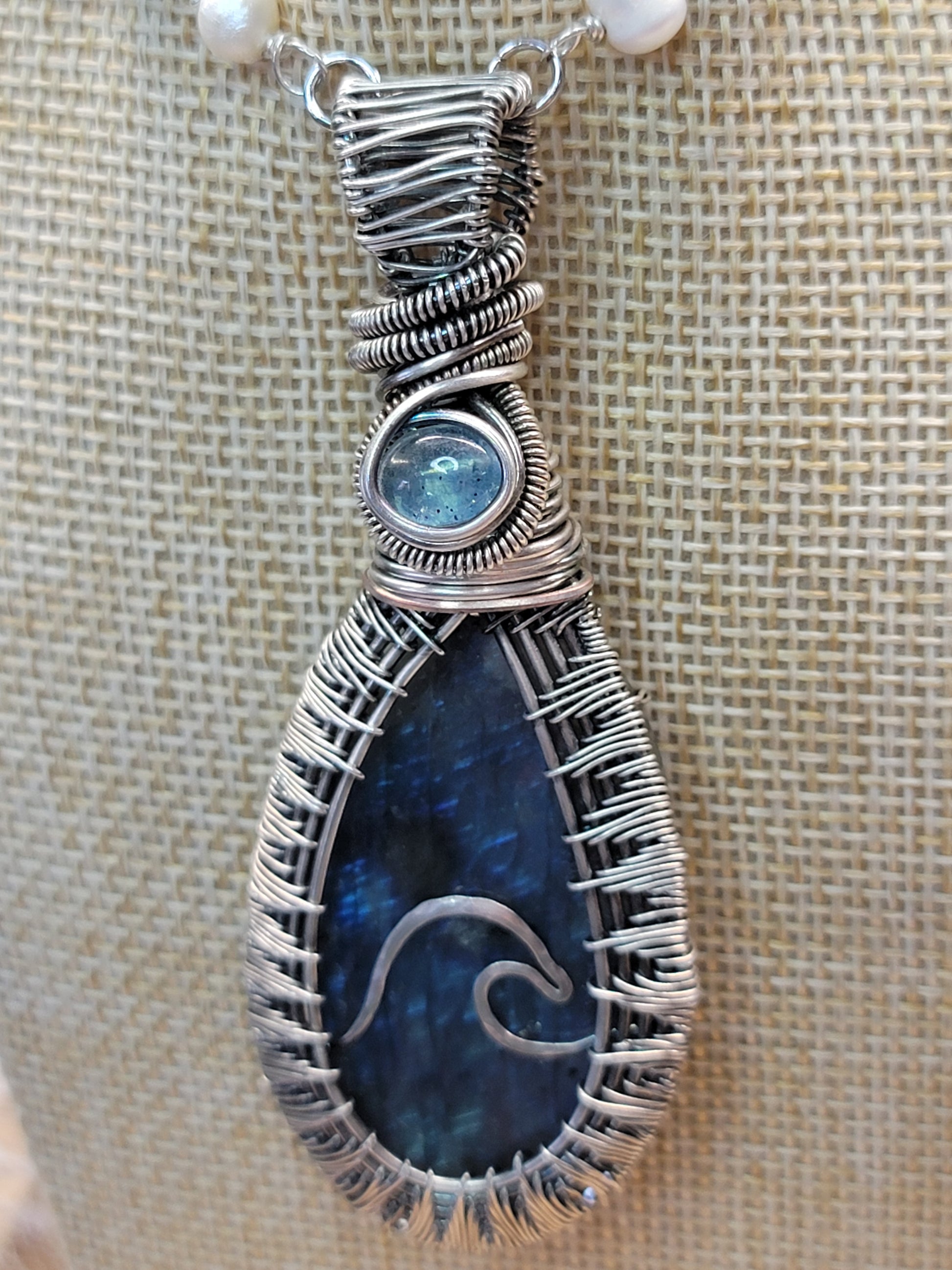 Experience the beauty and tranquility of this hand-crafted necklace featuring a stunning labradorite stone wrapped in Sterling Silver wire. The accent of Aquamarine adds a touch of the oceans salty air. While the 21" labradorite and Fresh water Pearl beaded chain create a unique and timeless piece."