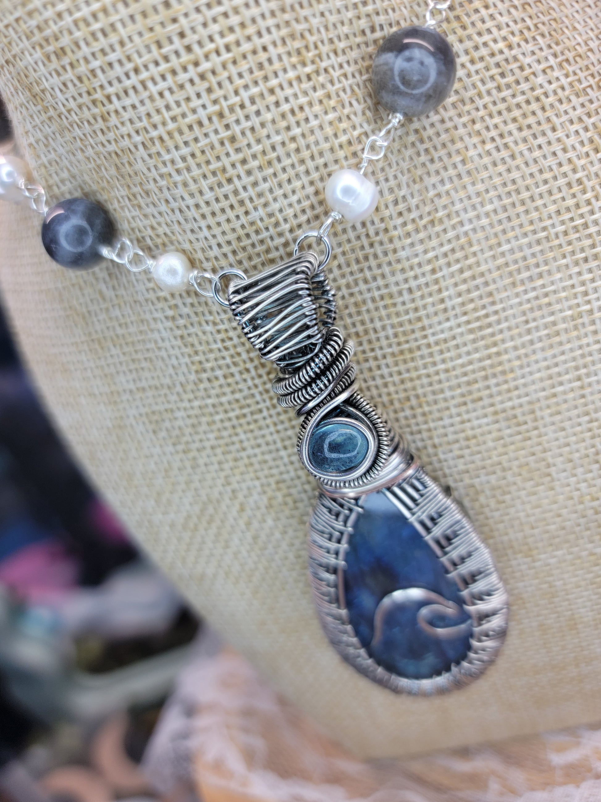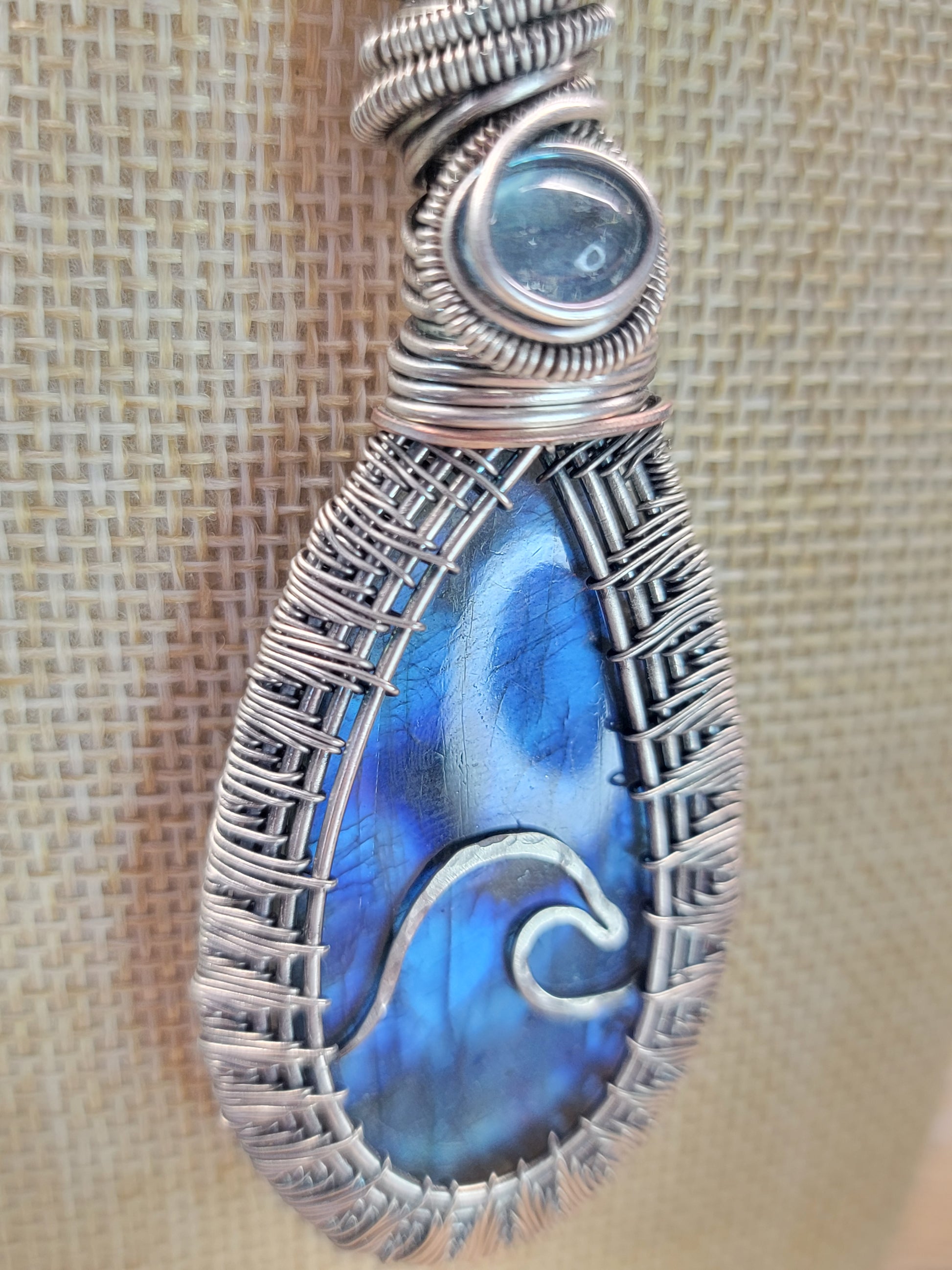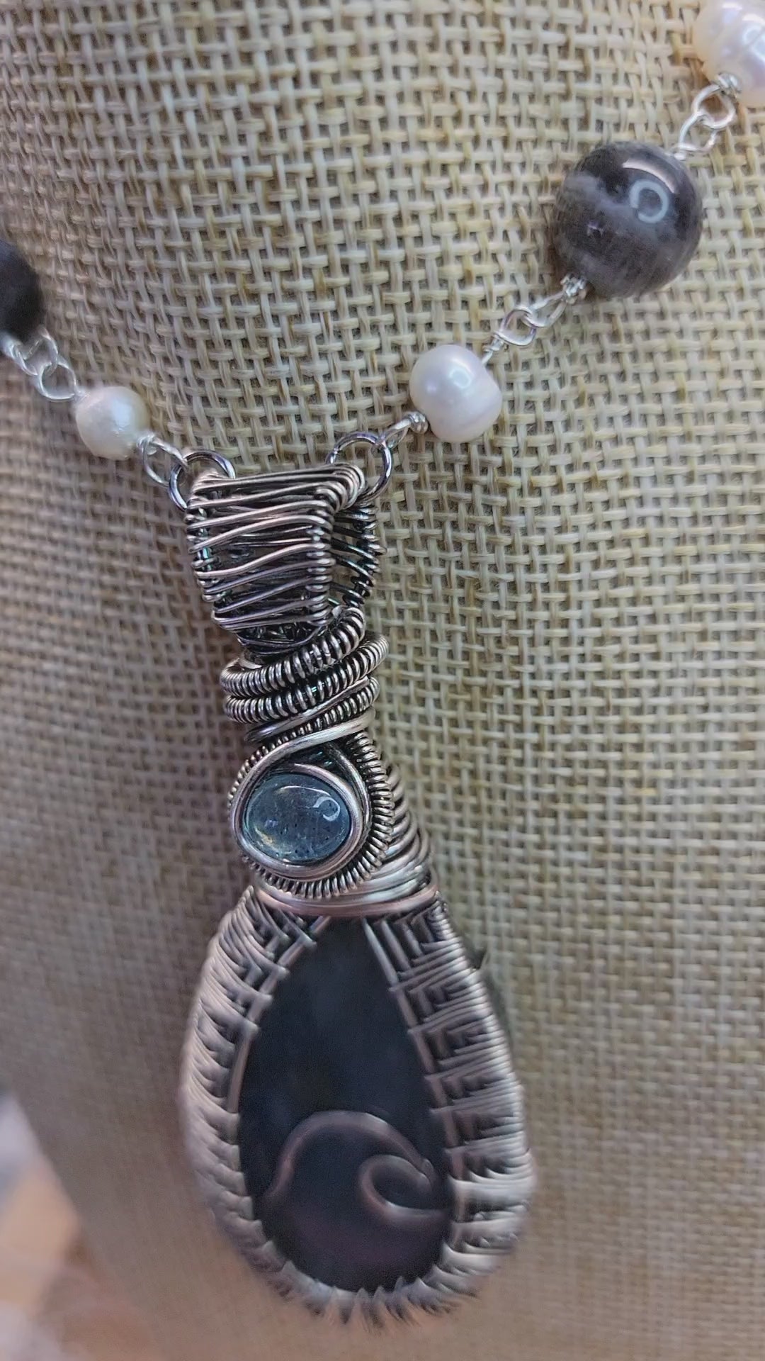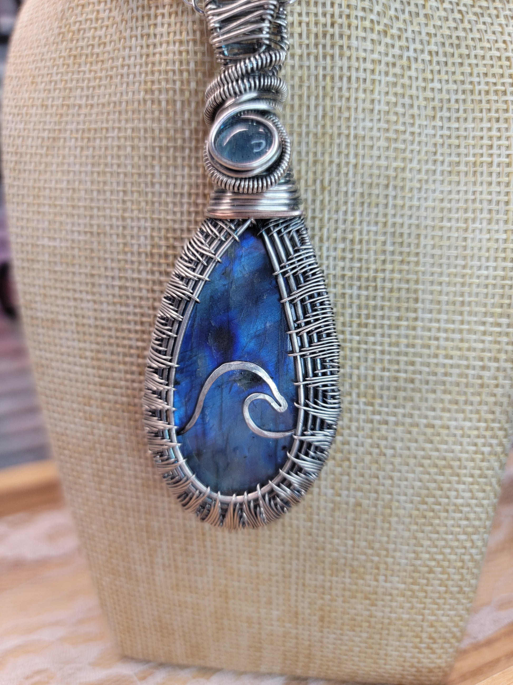Experience the beauty and tranquility of this hand-crafted necklace featuring a stunning labradorite stone wrapped in Sterling Silver wire. The accent of Aquamarine adds a touch of the oceans salty air. While the 21" labradorite and Fresh water Pearl beaded chain create a unique and timeless piece."