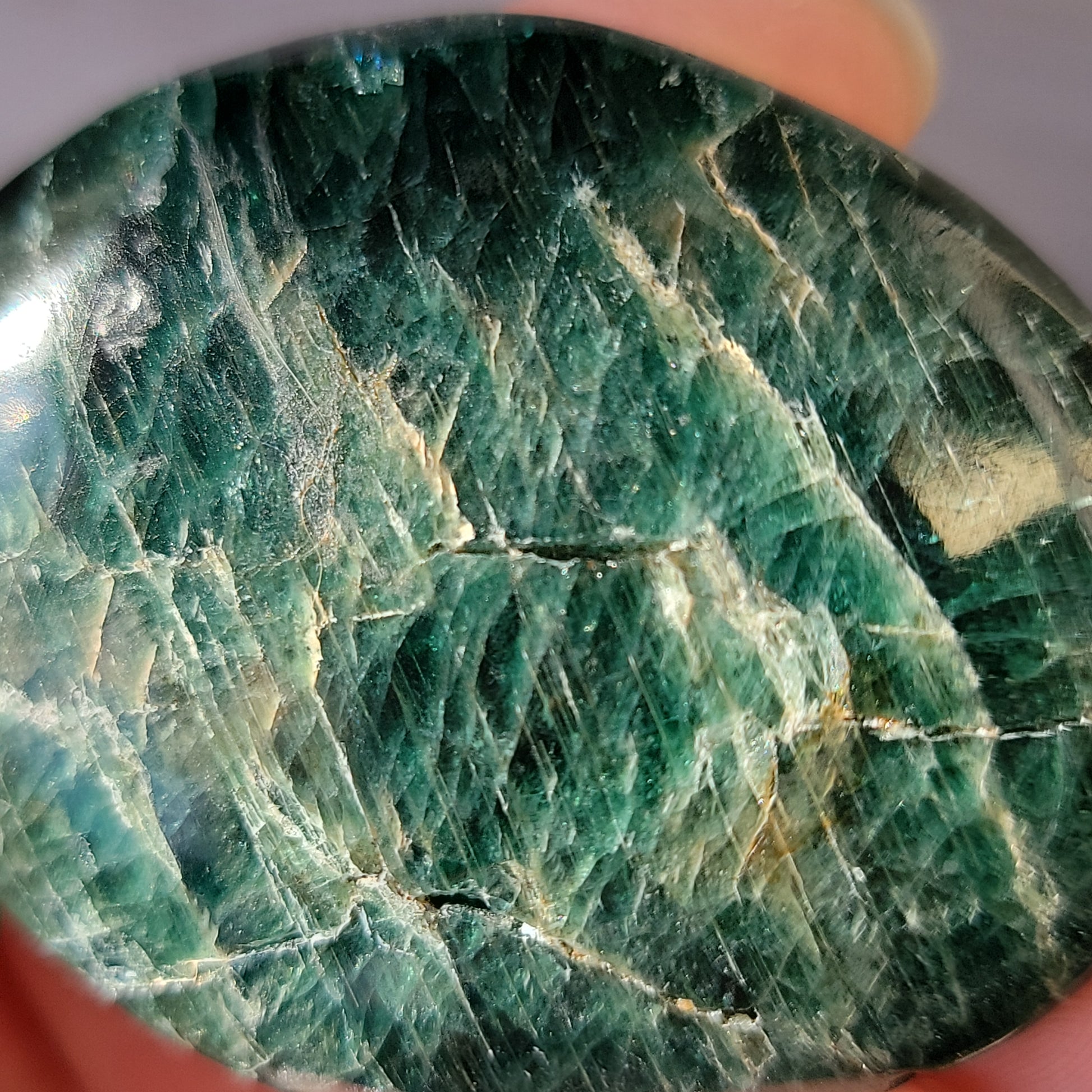 Blue Apatite is often called the "Stone of Manifestation" because it's said to manifest positive energy in daily life. Other meanings of Blue Apatite include: Clarity, Cleansing, Protection, Wisdom.