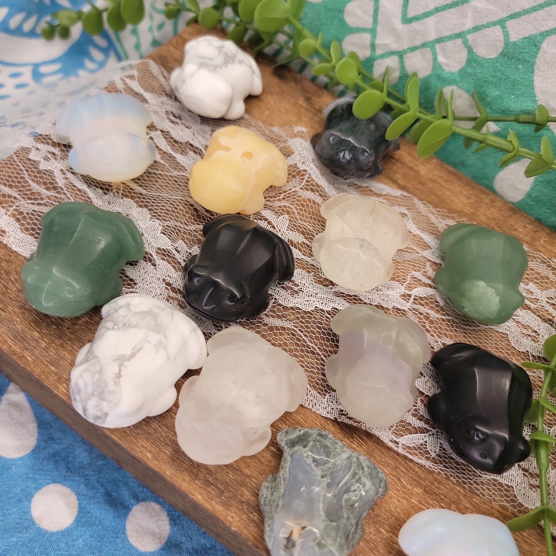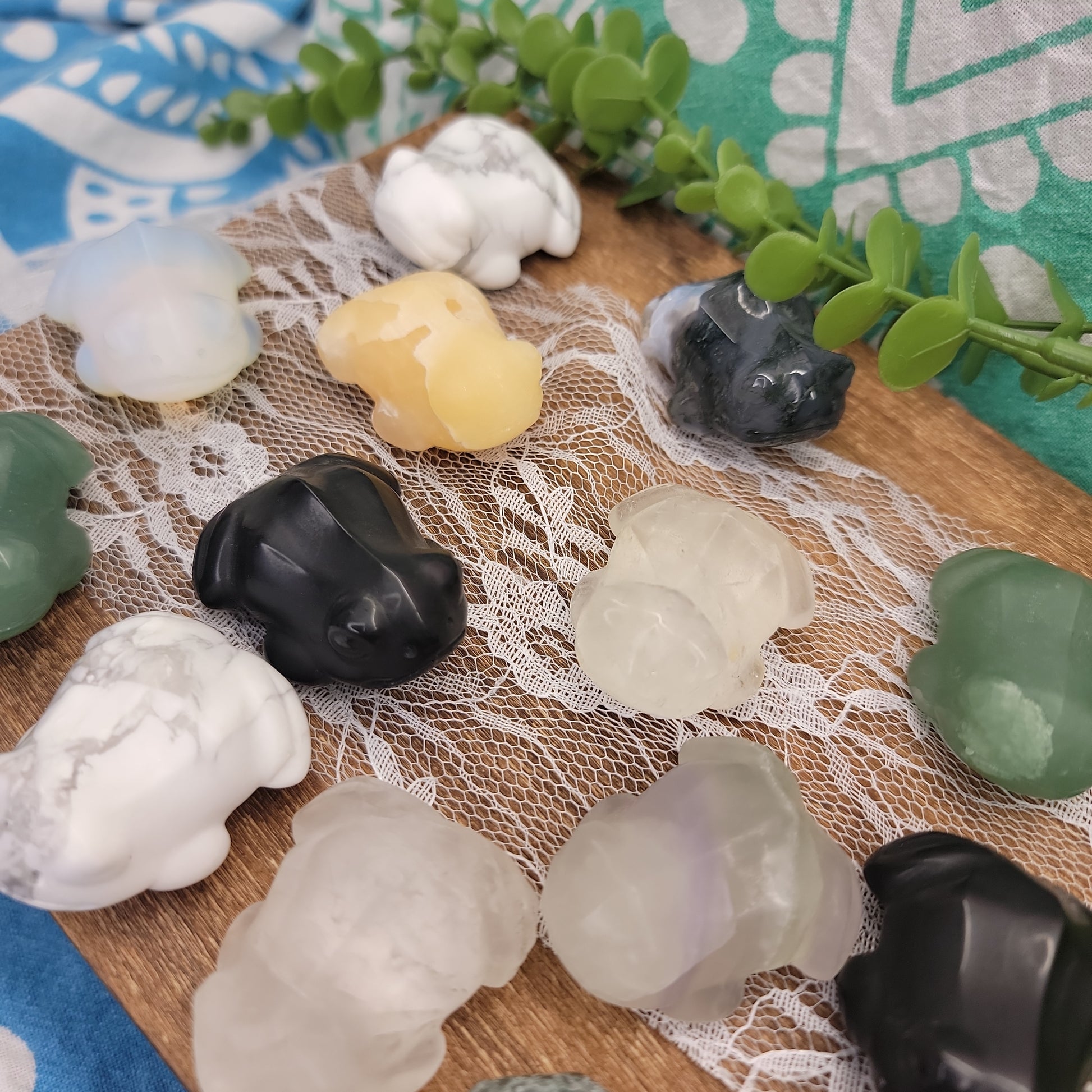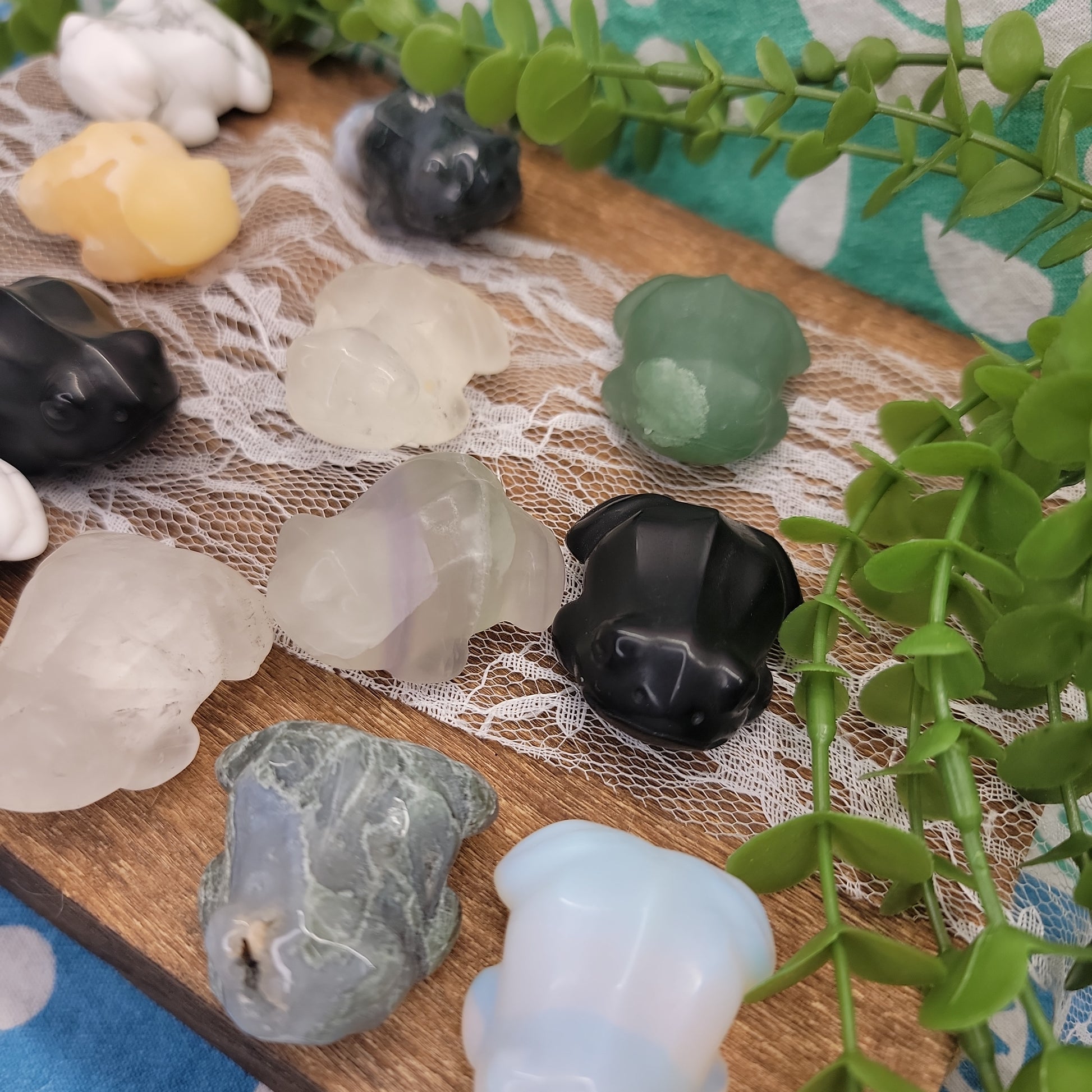 Frogs can be seen as a symbol of potential, transformation, purity, wealth, abundance, and good luck. Frog crystal carvings are available in a variety of shapes and sizes.
