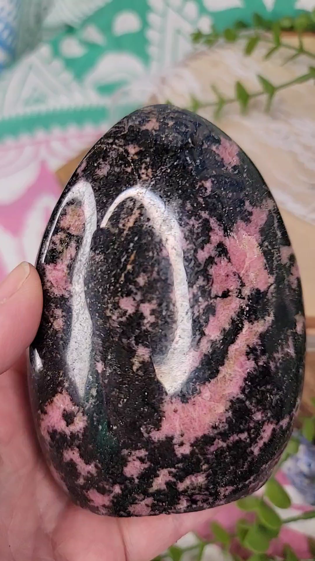 Some also use a rhodonite worry stone to help with anxiety, depression, and loving. To use it, carry the stone in your pocket and place your thumb in the indentation when you begin to feel your mood shift. This can activate different nerves in your hand and fingers to promote calmness, release endorphins, and have an overall euphoric effect.