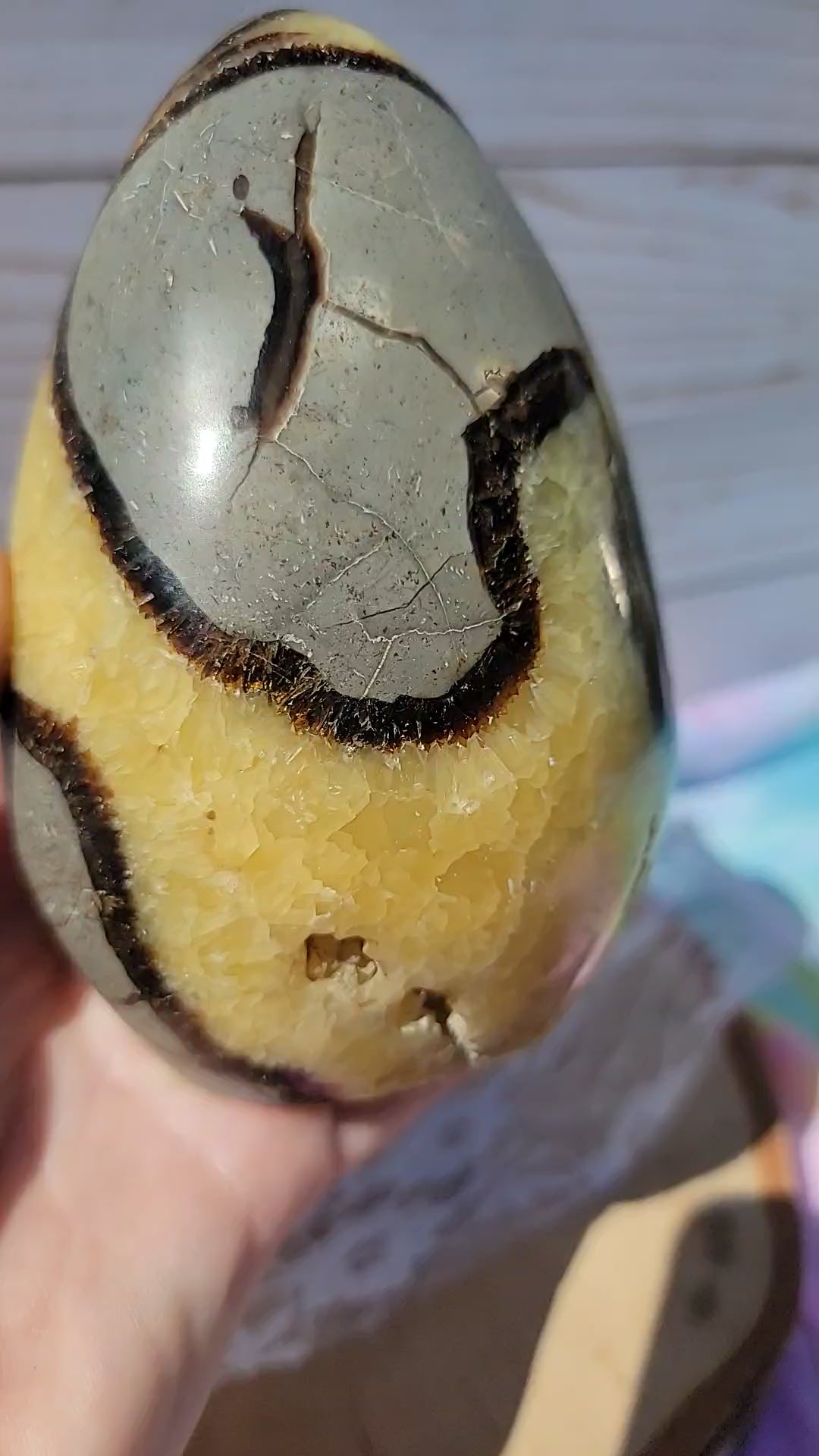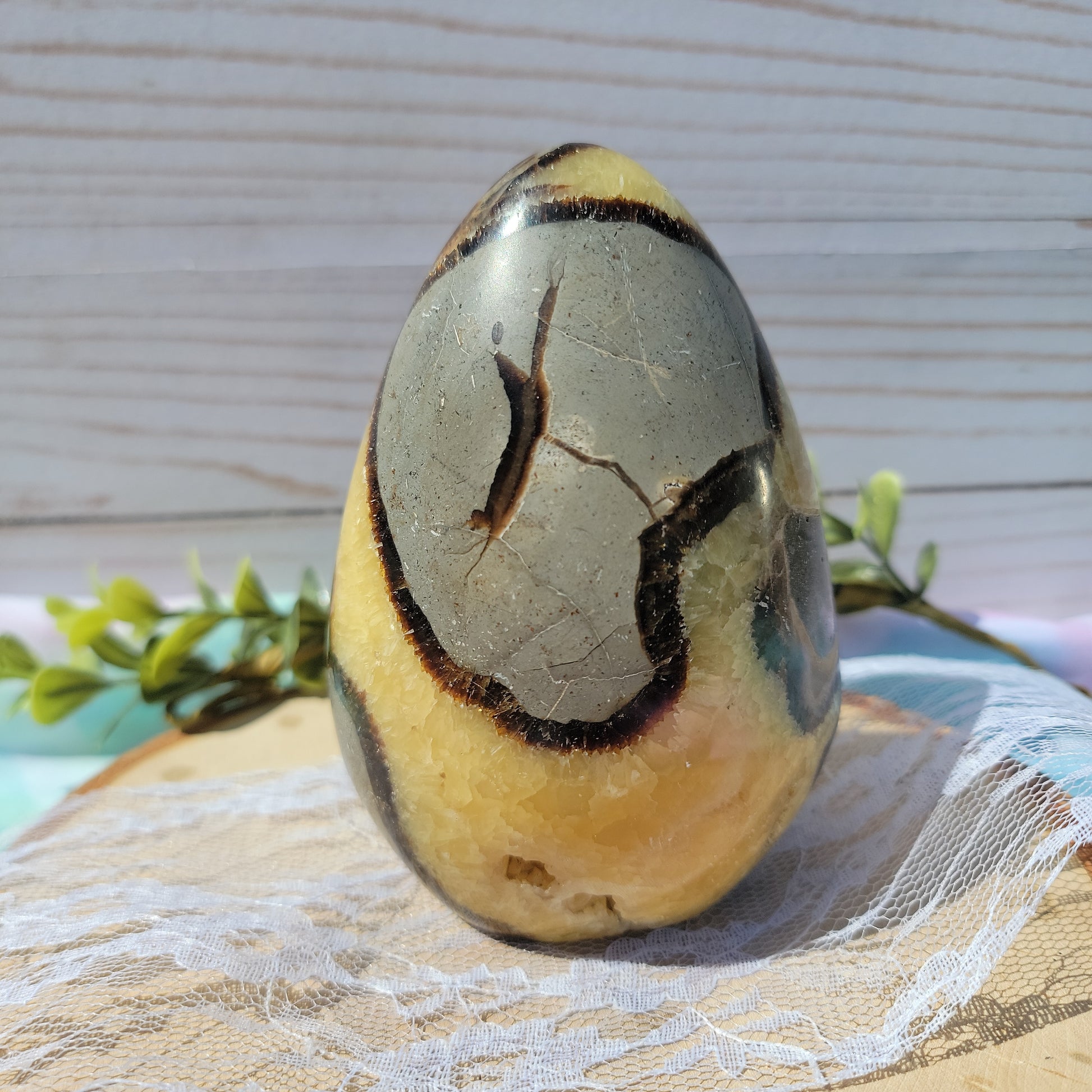 Septarian, also known as Dragonstone, is a yellow-colored rock that is a mixture of calcite, aragonite, and limestone. The name septarian comes from the Latin word septem, which means "seven" because it seems to form in patterns of seven