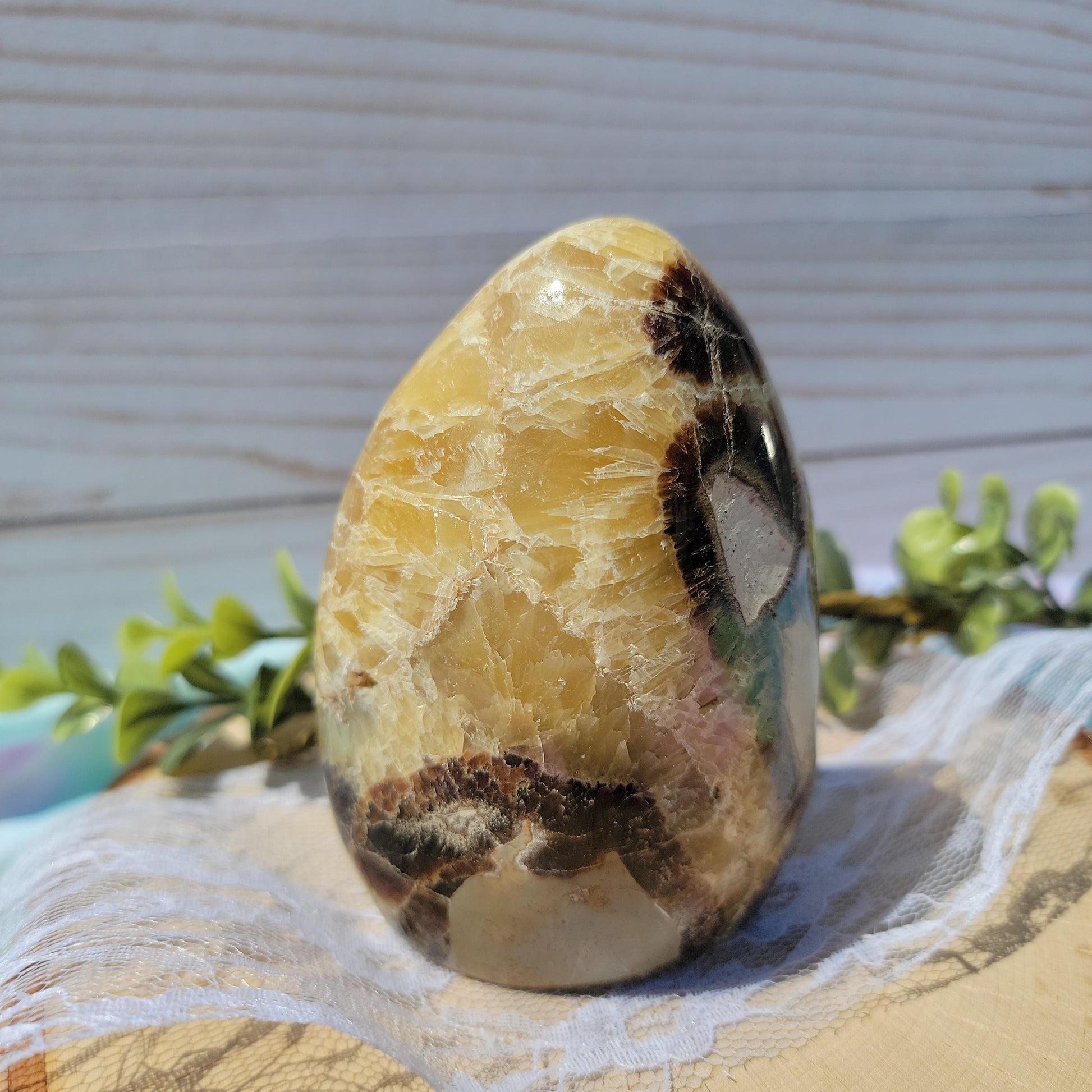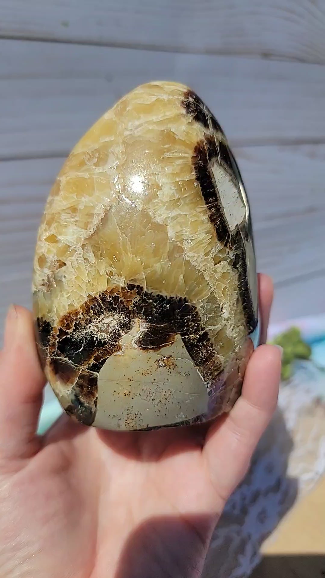 Septarian, also known as Dragonstone, is a yellow-colored rock that is a mixture of calcite, aragonite, and limestone. The name septarian comes from the Latin word septem, which means "seven" because it seems to form in patterns of seven