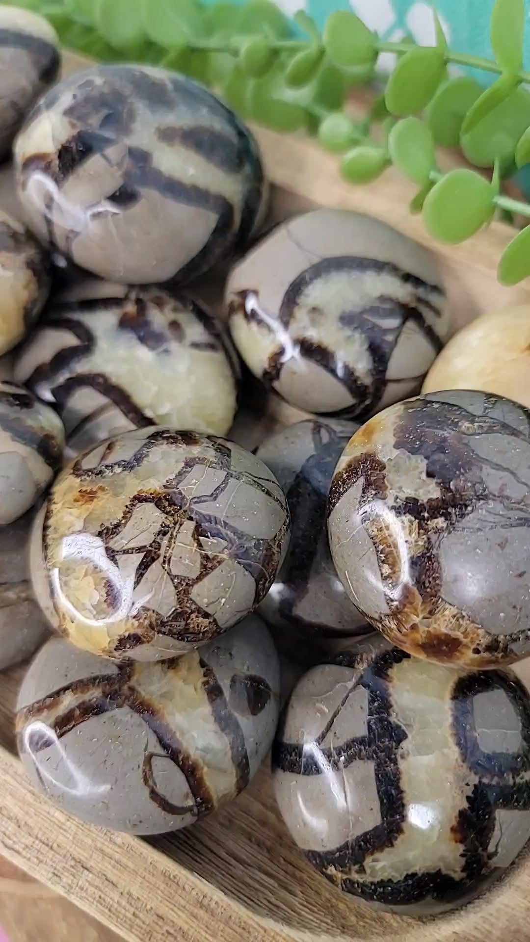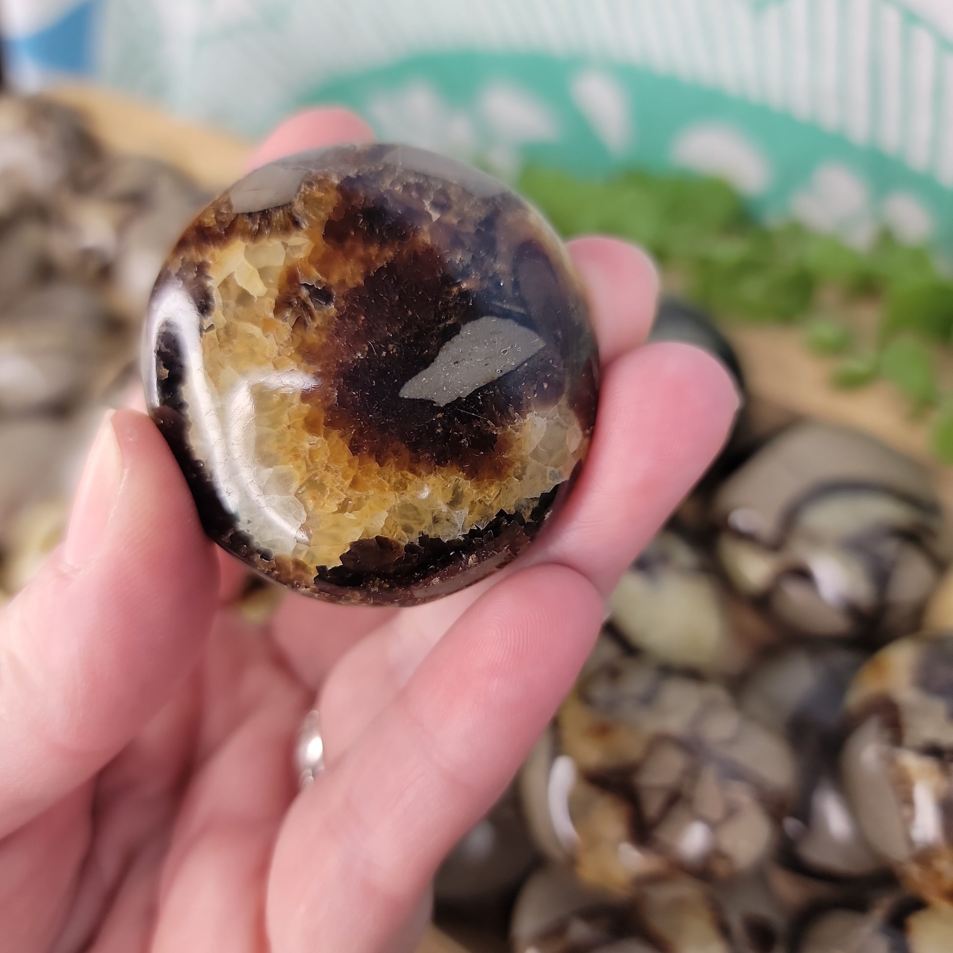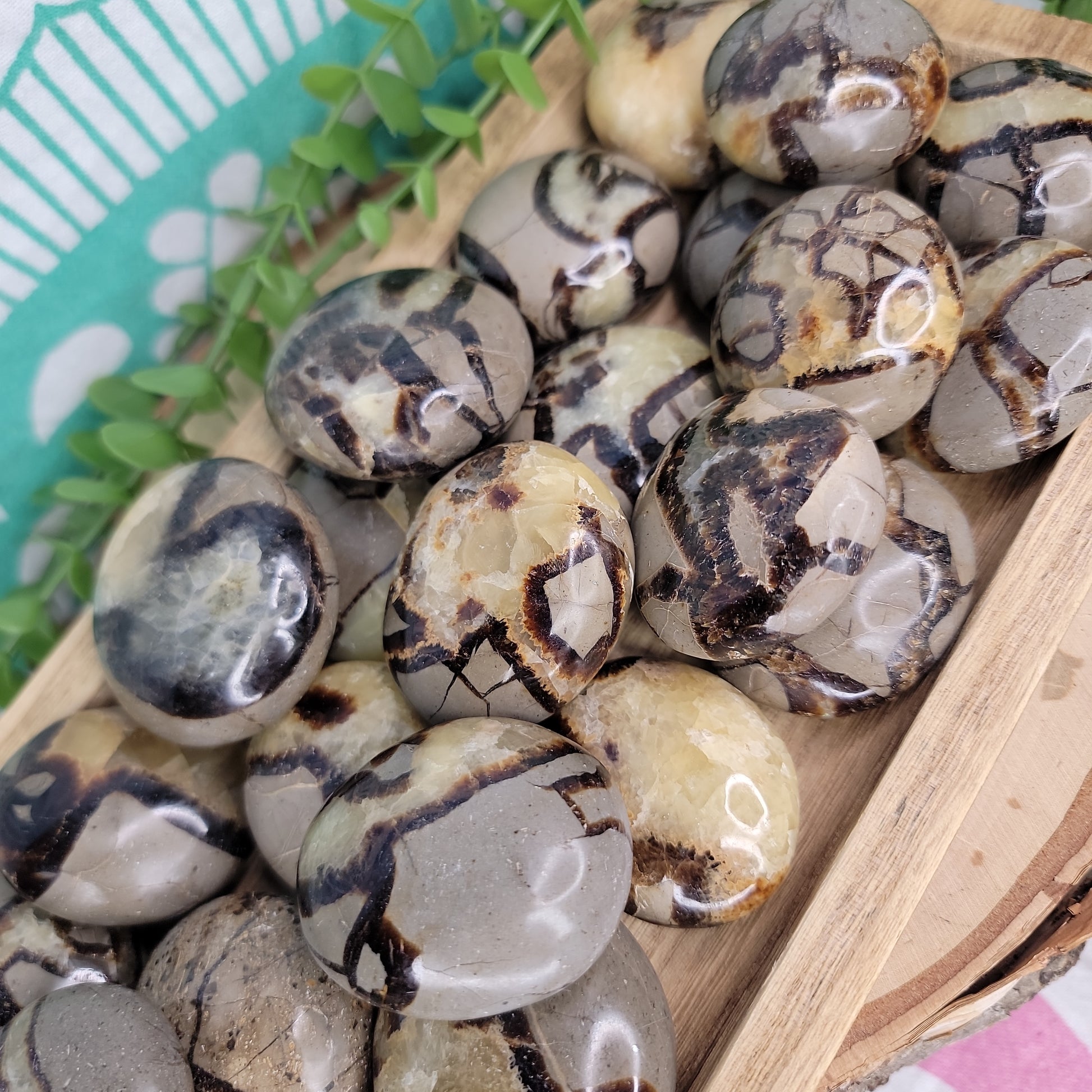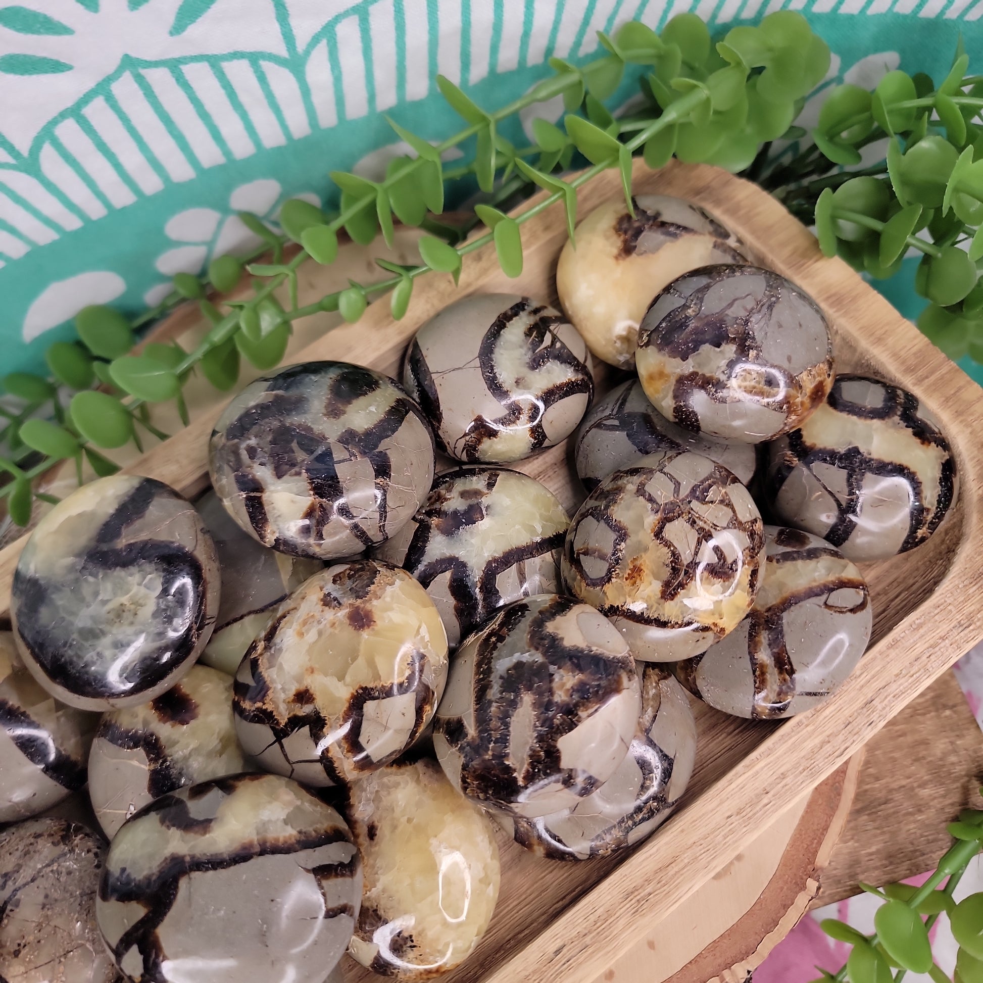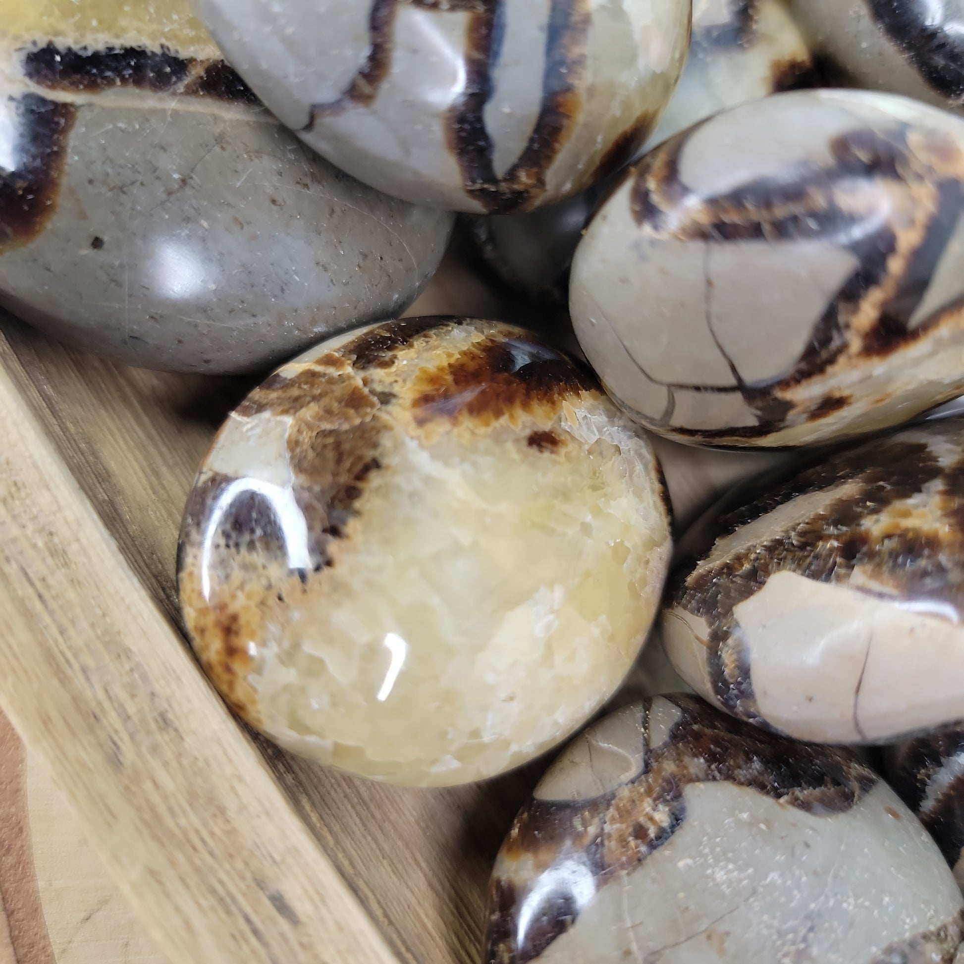 Septarian, also known as Dragonstone, is a yellow-colored rock that is a mixture of calcite, aragonite, and limestone. The name septarian comes from the Latin word septem, which means "seven" because it seems to form in patterns of seven